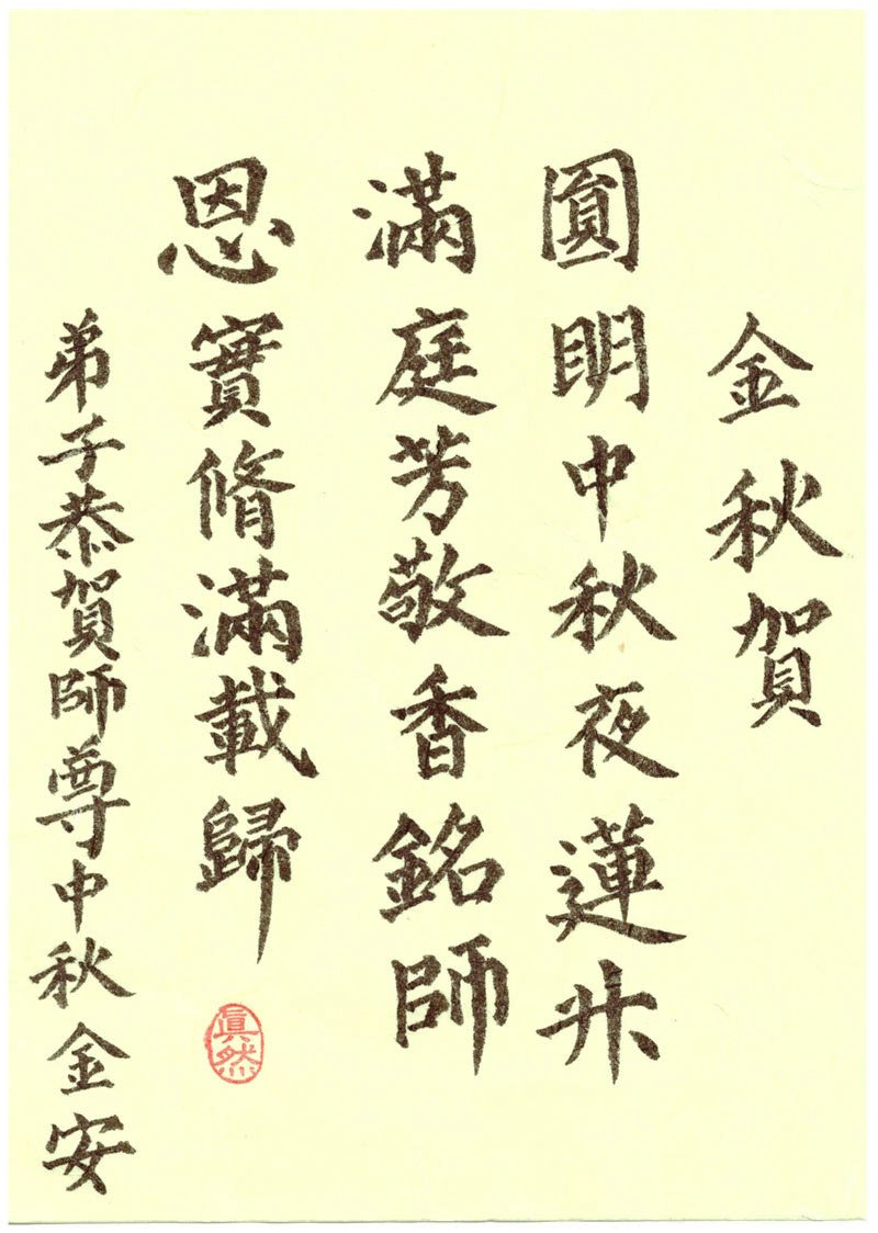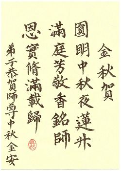 慈悲伟大的师尊:值此甲午年中秋佳节到来之际,北京地区大法弟子及亲属朋友,感恩伟大师尊的慈悲救度,洪恩浩荡,特此敬贺师尊中秋佳节吉祥如意!弟子们十分想念师尊,我们将在修炼这条路上做好三件事,实修到底紧随师!并奉上弟子的书法作品一幅:《金秋贺》。衷心祝贺师尊正法必成,大法弟子走正路、精進实修,收获丰收的金秋! 金秋贺 圆明中秋夜 莲升满庭芳 敬香铭师恩 实修满载归 北京大法弟子遥祝师尊中秋好!