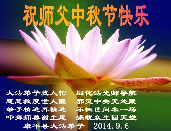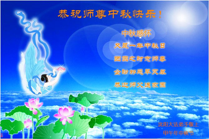 风尘苦海几度迷, 师尊慈悲打捞起; 大法洗净炼金身, 勇猛精進报师恩。 沈阳一税务系统大法弟子恭祝慈悲伟大的师尊中秋节快乐! 2014.9.7 辽宁省沈阳大法弟子恭祝伟大的师尊中秋佳节快乐!