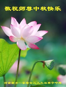 在这佳节来临之际,我们十分想念师尊!感恩师尊对我们的慈悲苦度。我们要听师尊的话,努力做好三件事,修好自己,兑现好我们的誓约,多救人!圆满随师还! 河南新乡市全体大法弟子 新乡大法弟子携全家恭祝师尊中秋节快乐! 新乡一大法弟子携女儿恭祝师尊中秋节快乐! 新乡市三个学法点的全体大法弟子恭祝师尊中秋节快乐! 河南省濮阳地区一学法小组全体大法弟子祝师父中秋佳节快乐!