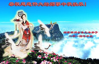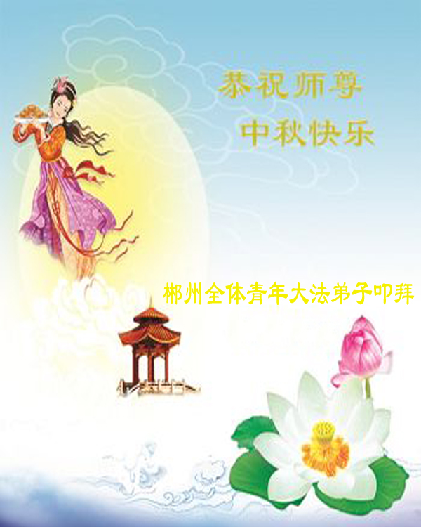 每逢佳节倍思亲,在2014年中秋节到来之际,湖南邵东大法弟子祝慈悲伟大的师尊中秋节快乐!师尊辛苦了!弟子知道,唯有做好三件事,才不负师尊的慈悲救度,也是弟子的责任。弟子一定会勇猛精進的,请师尊放心。 湖南邵东大法弟子 2014年9月7日 湖南郴州一老年大法弟子敬祝慈悲伟大的师尊中秋节快乐!