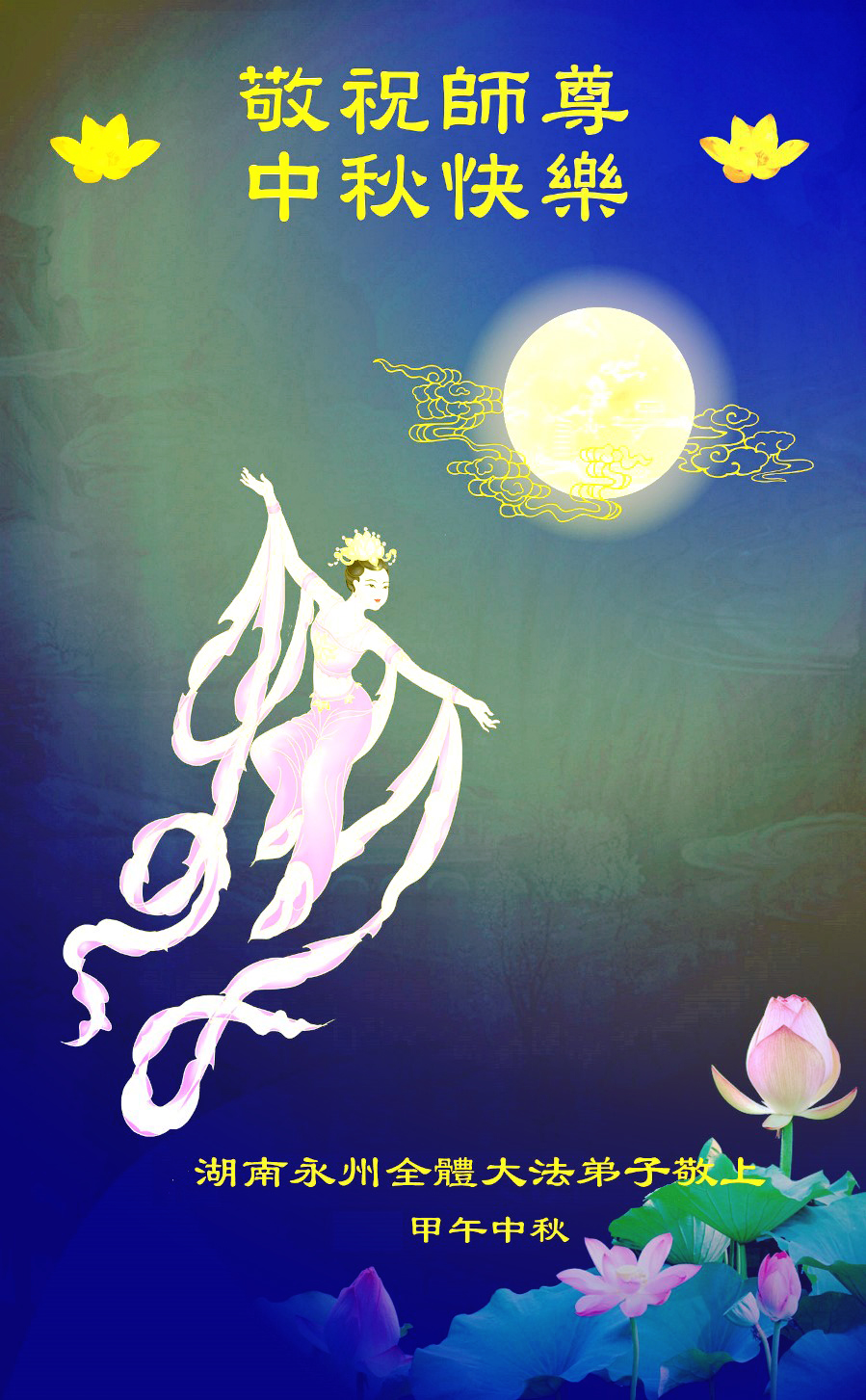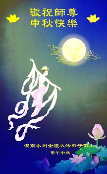 “月到中秋分外明,每逢佳节倍思亲。”弟子们用千言万语也无法表达对师父的敬仰和感恩! 值此佳节,我们全体大法弟子向师父合十问好:师父,您辛苦了! 在这佛恩浩荡的慈悲中,无时无刻都在师父的呵护下,我们度过这十五载坎坷证实大法之路。在走好走正最后的正法之路,在修正自己的同时,认真做好师父要求的三件事,实现史前的洪誓大愿,慈悲救度更多的众生,稳健走好每一步,共同迎接普天同庆、同祝、同颂的那一天,渡船起航随师归家园。 湖南郴州全体大法弟子叩拜 湖南娄底市大法弟子祝师尊中秋快乐!