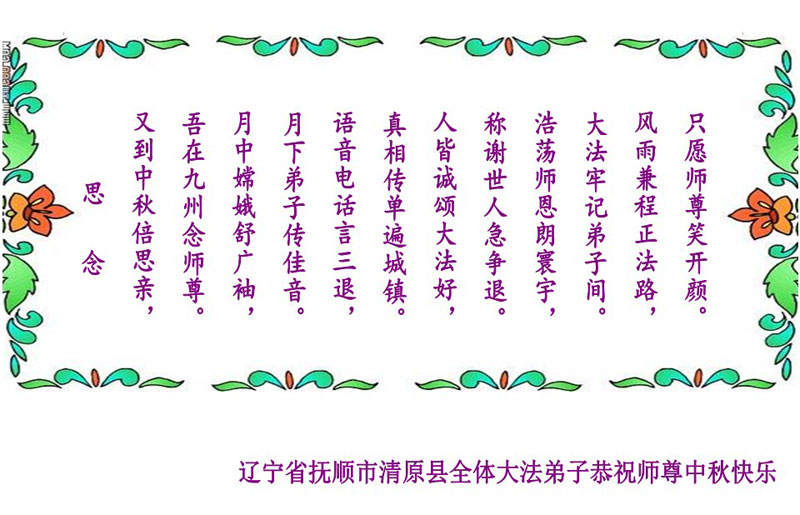辽宁省抚顺市清原县全体大法弟子恭祝师尊中秋快乐!