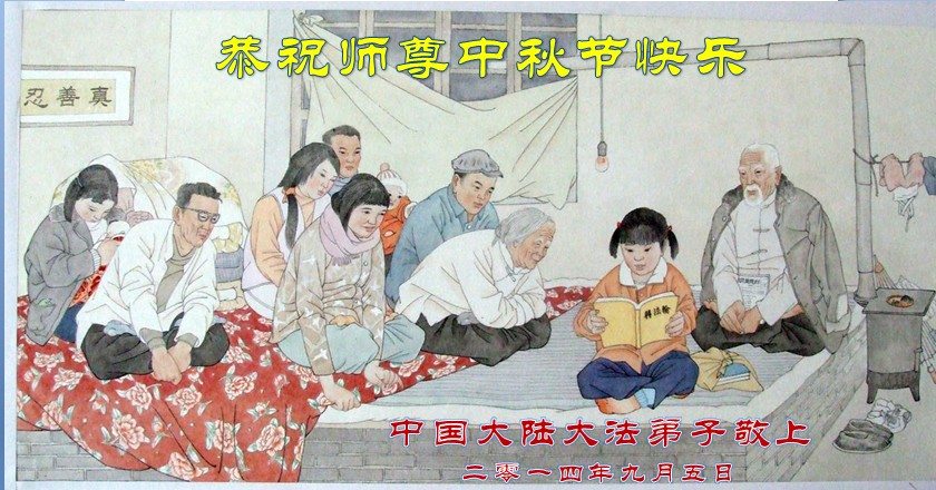 我代表我们学法小组、家乡和家族全体大法弟子恭祝慈悲伟大的师尊中秋节快乐! 师父啊,弟子们想念您,虽然我们远隔重洋,但弟子能感觉到师父就在身边处处呵护着我们。我们无法用语言表达对师父的感恩,只能在最后时期努力做好三件事,不辜负师父的慈悲苦度,我们期望能早日见到师父。 2014年9月6日 山东省聊城市莘县一家八口全体大法弟子恭祝师尊中秋节快乐!