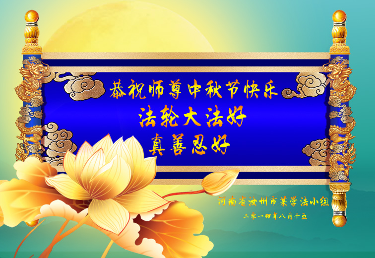 长春四分局一学法小组全体大法弟子恭祝师尊中秋快乐,请师尊放心,弟子们一定牢记师尊教诲,越最后越精進,整体升华,整体提高,做好三件事,圆满随师还。 长春四分局一学法小组全体大法弟子敬上 2014年9月7日 山东蒙阴大法弟子恭祝师尊中秋快乐!