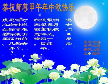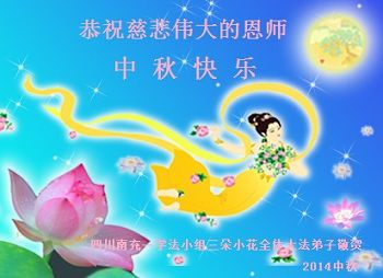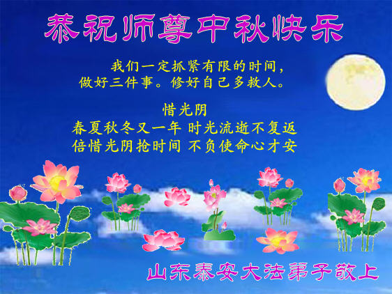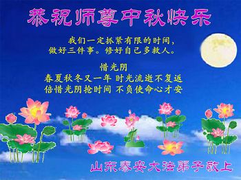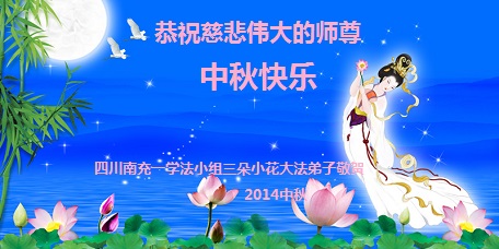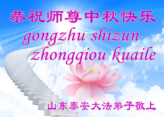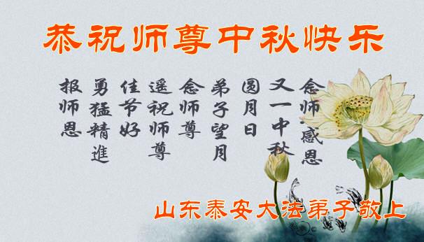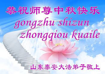 慈悲伟大的师父:中秋节好!师父您辛苦了!弟子们想念您! 请师父放心,弟子们一定做好该做的三件事,圆容好师父所要的,管好我们的每思每念,遇事向内找,做到整体提高共同精進!跟上师父的正法進程!坚定的走好、走正师父安排的路!完成好我们的史前大愿!圆满随师还! 山东烟台芝罘区全体大法弟子敬上 二零一四年九月六日 山东石岛大法母女恭祝恩师中秋快乐!