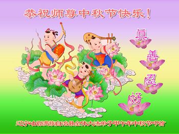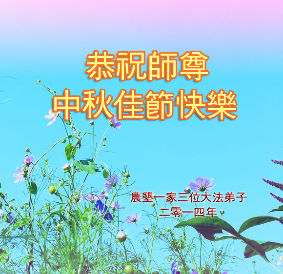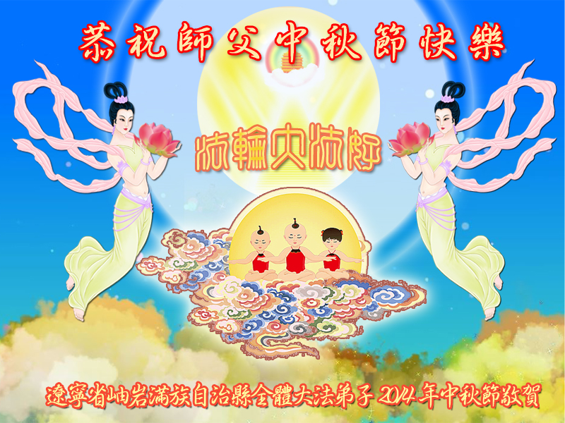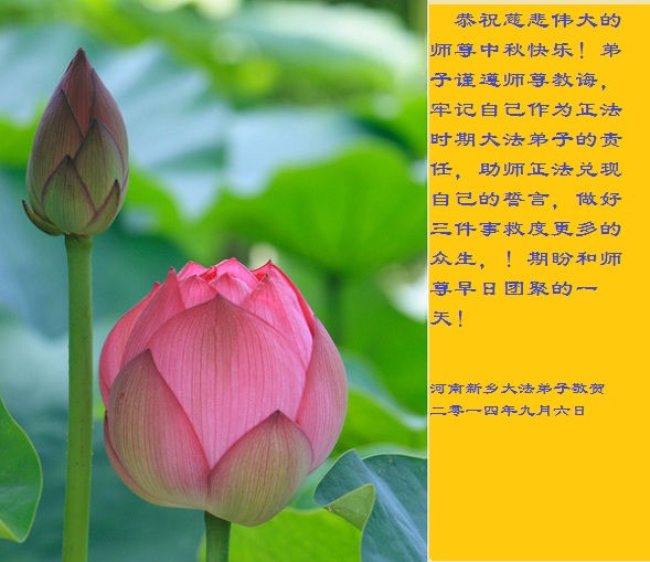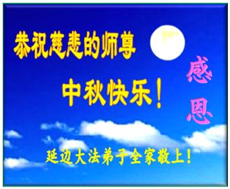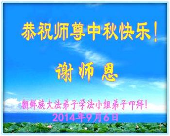 在这佳节来临之际,祝师尊节日快乐! 我们所有的弟子都感受到师尊洪大的慈悲,艰辛的苦度,时刻在弟子身边呵护着每个弟子,这种感恩的心,无法用语言能表达的,只有精進实修,做好三件事,兑现誓约,救度更多众生才能以报师恩。 河南沈丘全体大法弟子 二零一四年九月六日 吉林省延边大法弟子恭祝师尊中秋佳节好!