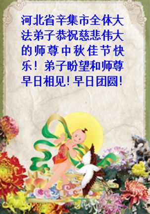 慈悲伟大的师尊您好:中秋佳节到了,河北省辛集市全体大法弟子恭祝师尊节日快乐! 请师父放心,我们越到最后一定更要精進,做好三件事,早日和师尊相见,多谢师父慈悲救度!双手合十! 河北省辛集市全体大法弟子 2014/9/6 我们河北省石家庄建明小区全体大法弟子恭祝师尊中秋快乐!