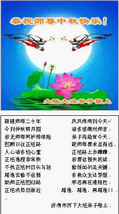 我们这里的大法弟子一定会谨记师尊的教诲,会做好大法弟子应该做好的三件事。师尊您辛苦了!值此佳节,恭祝师尊中秋节快乐!弟子们跪拜师尊!合十! 山东济南市放下大法弟子恭祝师尊中秋快乐!