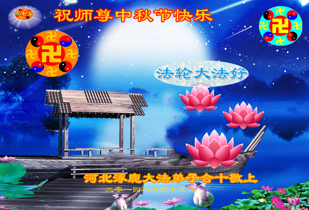 尊敬的师尊您好! 我们河北省张家口地区涿鹿县的全体大法弟子叩拜师尊:中秋节快乐! 又到中秋月圆时,我们的心里无时不在想念师父,期盼师父早回中原,那个时候才是真正月圆时…… 你的弟子们知道:正法已到最后的最后了,我们将不负师父救度之恩,精進实修,学好法,发好正念,讲好真相,多救人,遇事向内找,整体升华,整体提高,让师父放心! 二零一四年八月二十五日 河北省唐山市遵化市大法弟子恭祝师尊中秋快乐