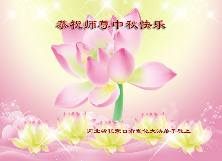 慈悲伟大的师尊您好! 明天就是中秋节了,每逢佳节倍思亲,我们非常想念您。慈悲的师尊您好!您辛苦了!您为我们付出的太多太多,我们都能感受到您时时刻刻在呵护着我们。此时此刻,我们只能用在今后的多学法、多讲真相、多救人的实际行动,来报答师尊给予我们的一切,让您少一份操劳,多一份欣慰。 祝师尊中秋佳节快乐! 唐山市老年夫妻大法弟子 2014年9月7日 河北省张家口市宣化大法弟子恭祝师尊中秋快乐!