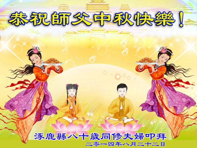 向慈悲伟大的师尊问好! 日出日落,月缺月圆,不觉中又迎来了二零一四年的中秋佳节! 大法弟子经历了旧势力和邪*党-邪灵的残酷迫害后,历经风雨、打压,我们经受了考验,能走到今天, 能无悔于师尊的大法弟子。我们都深感师尊的付出,承受和给予,对师尊的佛恩浩荡,我们铭刻在心,定要做好三件事回报师恩! 师尊请接受弟子的节日问候!恭祝师尊中秋快乐! 广州番禺大法弟子敬贺 二零一四年九月二日 广东省广州市天河区一学法小组四位大法弟子恭祝慈悲伟大的师尊中秋快乐!