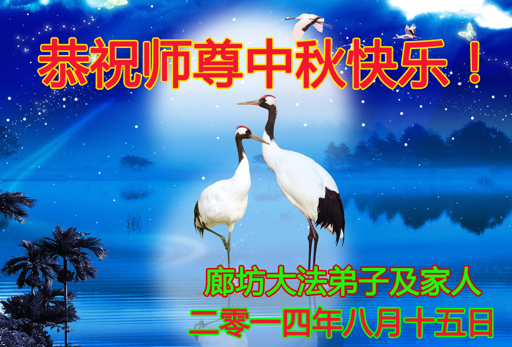 三河大法弟子一定努力形成整体,协调配合好,做好三件事,更多的救度众生,用我们的修炼成果报答师尊的救度之恩!师父辛苦了!全体三河大法弟子叩拜师尊,祝伟大师尊中秋好! 广东省广州一大法弟子及家人恭祝师尊:中秋节快乐!