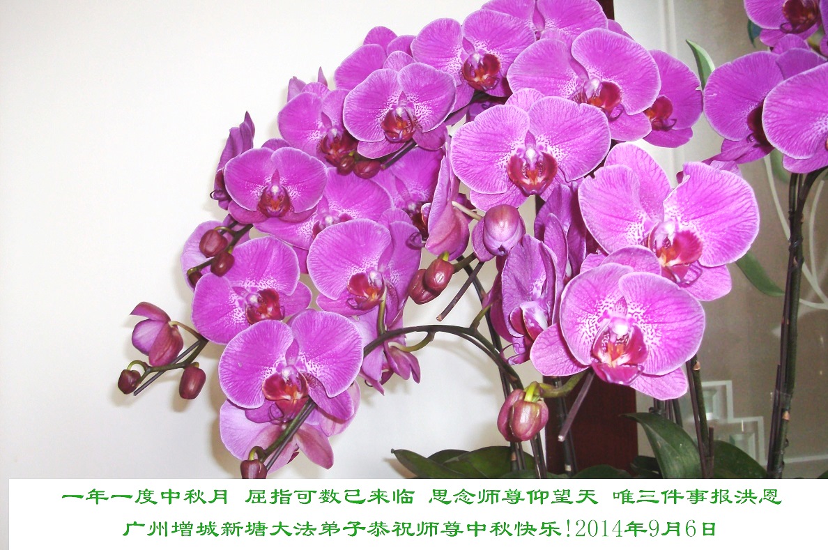 在最后的阶段我们一定要完成弟子的使命和责任,共同配合好,做好三件事,给师父一个满意的答卷,圆满随师还。 2014年9月7日 广东省广州市增城区全体大法弟子恭祝师尊中秋节快乐!