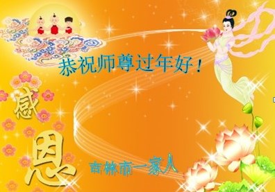 尊敬的师父:您好! 2016年即将来临,我和母亲(同修)、妹妹(同修)提前祝师父新年快乐! 我们过去都是疾病缠身的人,修炼大法后,是师父给我们消去病业,使我们成了身心健康的人,我们对师父的感恩无以言表,唯有精進实修来报答师父,谢谢师父!谢谢师父!再次祝师父新年快乐! 吉林市大法弟子 二零一五年十二月二十二日 吉林市大法弟子及明真相家人恭祝师父新年快乐!