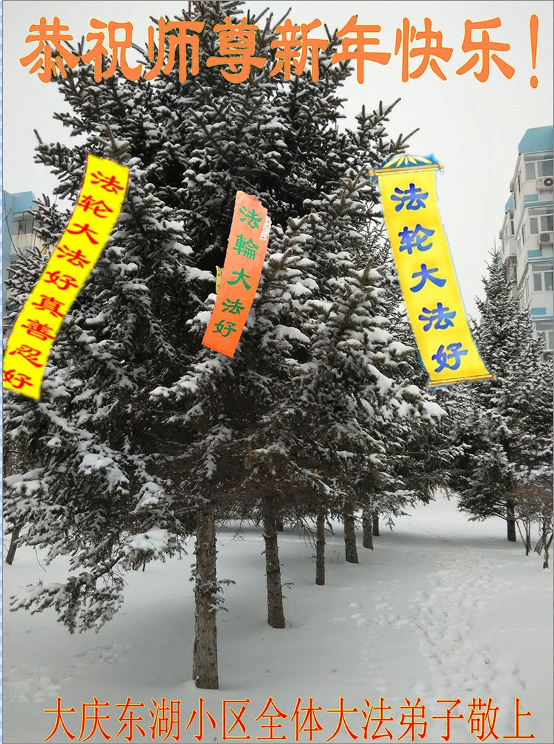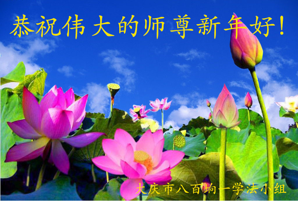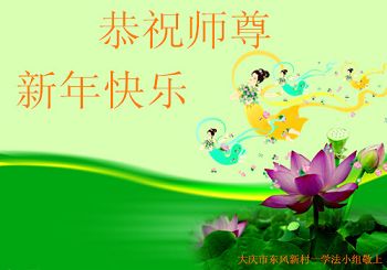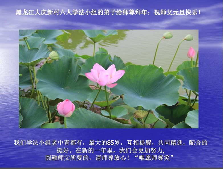 黑龙江省大庆东风新村一学法小组弟子恭祝师父新年快乐!