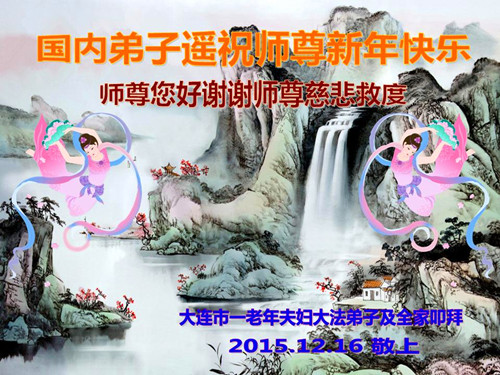【明慧网二零一五年十二月二十九日】 辽宁省大连市金州区石河镇全体大法弟子恭祝慈悲伟大的师尊新年快乐!