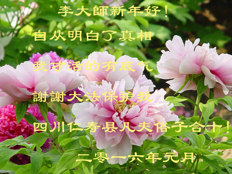 河北省平山县全体明真相的民众恭贺慈悲的李洪志大师新年快乐! 中国大陆卫生系统全体大法弟子叩拜师尊!恭祝慈悲伟大的师尊新年快乐! 湖北省荆州市公安县大法弟子及亲人恭祝李大师新年快乐!