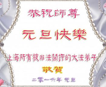 关山点点春, 慈悲暖人心。 处处颂法声, 遥遥贺师尊。 狱中全体大法弟子遥叩师尊 二零一五年十二月十九日 上海所有被非法关押的大法弟子恭祝师尊元旦快乐!