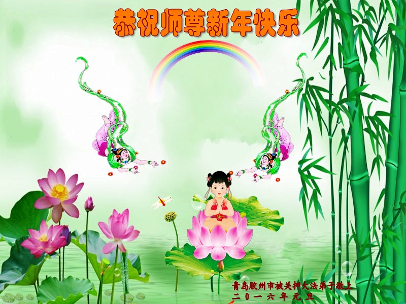 伟大的师父:新年好!师父辛苦了! 谢谢师父!感恩师尊慈悲呵护!弟子跪拜师父! 弟子坚修大法到底,圆满跟师父回家。 2015年12月12日 山东省潍坊市青州市所有大法弟子包括所有被非法关押的大法弟子恭祝师尊元旦快乐!