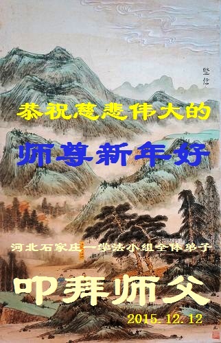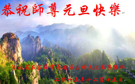 感谢师尊 慈悲救度!让我们明白了宇宙法理和人来世的目地。弟子谨听师父教诲,一定精進实修,做好三件事。 2015年12月16日 河北省石家庄市正定县全体大法弟子恭祝师尊元旦快乐!