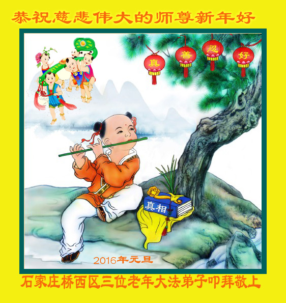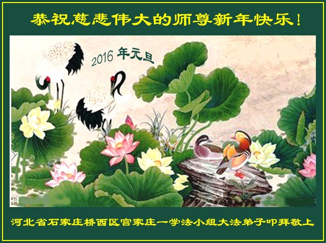 河北省石家庄桥西区宫家庄一学法小组大法弟子叩拜敬上 二零一六年元旦 河北省石家庄桥西区三位老年大法弟子恭贺慈悲伟大的师尊元旦快乐!