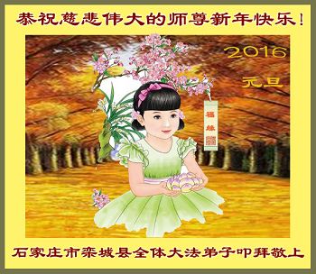 河北省石家庄桥西区三位老年大法弟子叩拜敬上 二零一六年元月 河北省石家庄市栾城县全体大法弟子恭祝慈悲伟大的师尊元旦快乐!