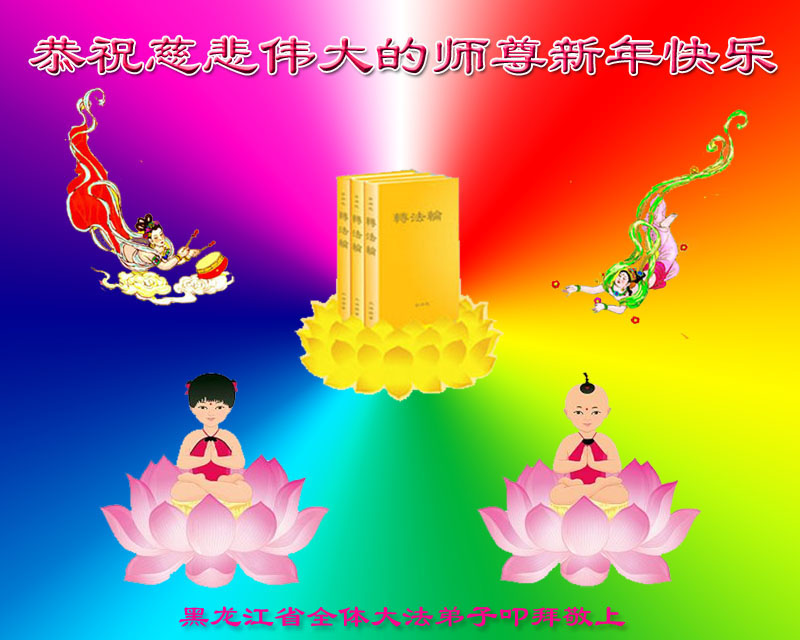 遥拜恩师贺新年 弟子感恩表心言 心怀慈悲救众生 师恩浩荡大过天 遥拜恩师贺新年 珍惜机缘不怠慢 弟子谨遵师教诲 修心救众道路宽 遥拜恩师贺新年 四面楚歌唾江蟾 二十多万诉状飞 法办江鬼日不远 遥拜恩师贺新年 选择三:退.保平安 退出两亿两千万 明白真相弃红船 遥拜恩师贺新年 感恩师尊亿万篇 纷纷飞到明慧网 恭祝师尊笑开颜 黑龙江省全体青年大法弟子恭祝慈悲伟大的师尊新年快乐!