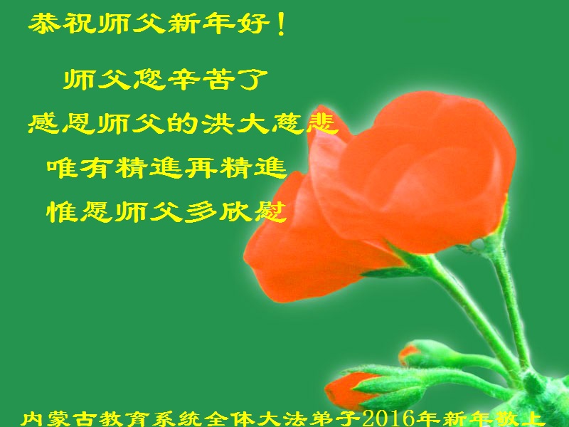 师父新年好!弟子会在新的一年里做好自己该做的,时间不等人,弟子一定要坚定实修,走好最后的路。 内蒙古教育系统全体大法弟子恭祝师父新年好!