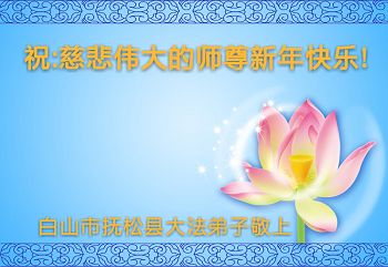 师尊您好! 身在中国大陆的吉林一大法弟子和家人恭祝您新年快乐!叩谢慈悲、伟大师尊的慈悲苦度,您辛苦了! 大陆一大法弟子和家人敬上 吉林省永吉县口前镇大法弟子恭祝慈悲伟大的师尊元旦快乐!