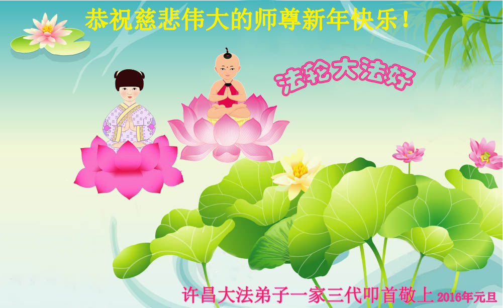 以感恩和崇拜的心恭祝伟大的师父新年快乐!大恩大德无以回报,我们全家跪拜师父,向伟大的师父拜年!弟子们不但走稳走正最后的路,三件事决不放松,以报师恩! 我们全家再次向伟大的师父跪拜叩首 太康县大法弟子 二零一五年十二月二十七日 河南许昌一大法弟子全家恭祝慈悲伟大的师尊新年快乐!感谢师尊慈悲救度!