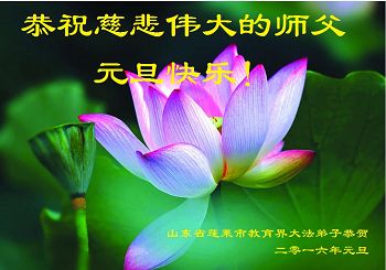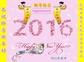 【明慧网二零一五年十二月三十一日】2016年新年到来之际,中国大陆和海外的大法弟子(包括新学员)和明白真相的民众,纷纷把发自内心的节日贺词、诗歌、自制的贺卡等寄给明慧网,恭祝李洪志师父新年好。以下是大陆教育系统大法弟子的贺词和贺卡。 广东实验中学大法弟子恭祝师尊新年好!