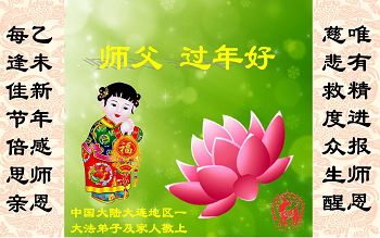 师父您好!师父辛苦了! 我要真正做到就听师父的话,做好三件事,助师正法,证实大法,走向大圆满。我及丈夫同修再次恭祝师尊过年好! 辽宁省大连市庄河市全体大法弟子祝伟大的师尊过大年好!