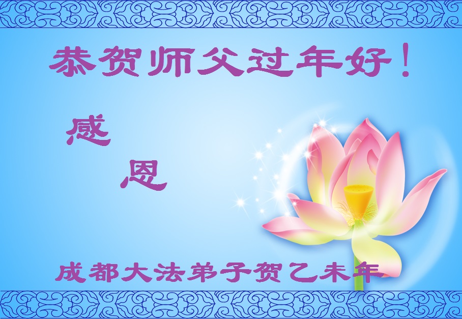 成都北门大法弟子给您拜年了! 是您把我们从地狱里捞起来成为修炼人,在您亲切呵护下走到了今天。 我们一定牢记师尊的教诲,遇事向内找,向内修,做好三件事精進实修,跟您回家! 四川省成都大法弟子恭祝慈悲伟大的师尊过年好!羊年快乐!新春快乐!