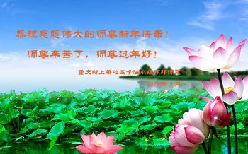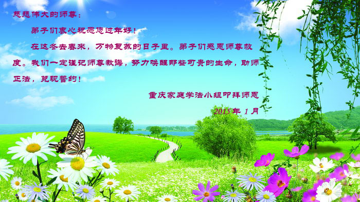 师尊您辛苦了! 在新的一年里我们一定要多学法,学好法,精進实修,做好师尊要求的三件事,让师尊少一份操劳,多一份欣慰。 重庆市沙坪坝区双碑一学法小组全体大法弟子恭贺 2015年1月29日 重庆万州区一学法小组全体大法弟子恭祝师父新年快乐!