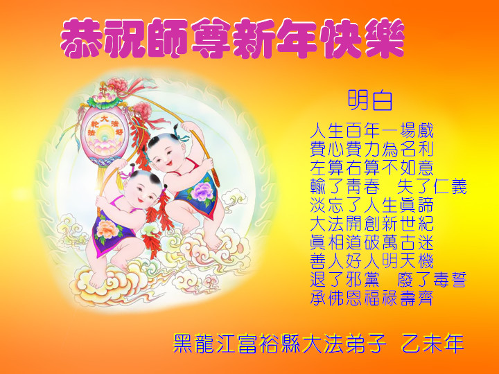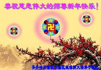师父您好!师父您辛苦了!弟子想念您! 新年来临想师尊 深渊里来捞业身 普度众生师恩护 乾坤茫茫转法轮 苍宇人间轮回转 师赐弟子正法身 助师正法除邪恶 三件事中炼金身 慈悲师父等弟子 新年伊始拜师尊 恭祝恩师过年好 圆满回归谢师恩 黑龙江省齐齐哈尔市富裕县全体大法弟子恭祝师父新年快乐!