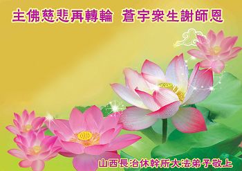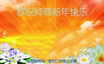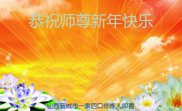 值此二零一五年中国新年即将到来之际,山西省晋城市城区全体大法弟子恭祝慈悲伟大的师尊新年快乐!师尊无量慈悲,为宇宙众生的得救,为大法弟子的得度承受巨大,我们对师尊的感恩无以言表,深知师尊与众生对我们的厚望,深感自己的责任重大,唯有紧跟师尊走好最后的路,尽全力做好三件事,救度更多众生,圆满随师还。 山西省晋城市城区全体大法弟子合十叩拜 二零一五年一月三十日 山西省晋城市沁水县全体大法弟子恭祝慈悲伟大的师尊新年快乐!