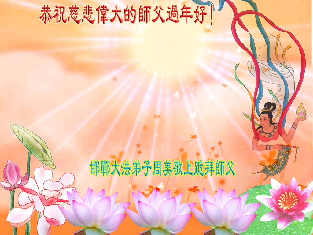 师尊您好!师尊您辛苦了! 弟子感谢师父救度之恩,弟子唯有精進,做好三件事,修好自己,多救人。叩谢师尊。 曲周县大法弟子 河北省邯郸市峰峰矿区市区片一学法小组全体大法弟子祝师尊新年快乐!
