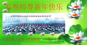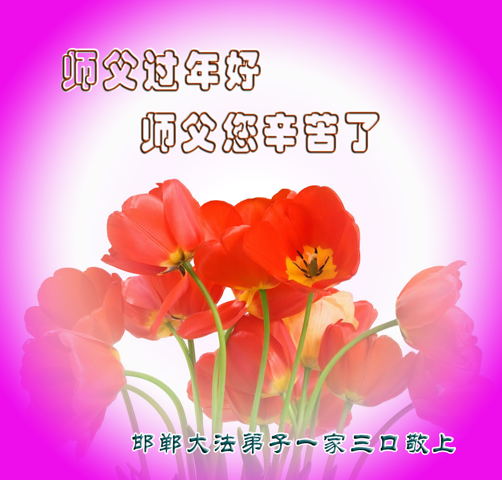 师尊您好! 二零一五年新年就要到了,我们全家在这里给伟大的师尊拜年了!祝师父您新年快乐! 在修炼的路上师尊不辞辛苦牵着我们的手,往上带我们,替我们承受着一切。 在新的一年里,弟子努力按师父的要求做好三件事,让师父欣慰,少些操劳。 师尊过年好!弟子跪拜师恩。 河北平泉一大法弟子 二零一五年二月 北京和平里地区的大法弟子恭祝慈悲伟大的师父新年快乐!