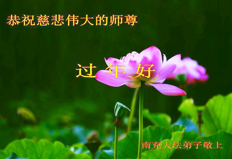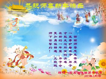 师父:您好! 在二零一五年新年到来之际,我们学法小组全体弟子给师父拜年,恭祝师父新年快乐! 我们一定做好三件事,多救人,精進实修,圆满随师还! 南充两学法小组 二零一五年二月 四川省遂宁市大法弟子恭祝慈悲伟大的师尊新年快乐!