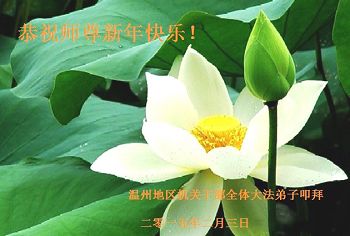 我们是佳木斯市的一家人。我们中,有的是文革前的本科生,有的是上世纪八十年代的重点本科生,有的在政府部门或银行工作,也有的是在校学生。不论什么身份,我们都相信法轮大法好、真善忍好!我们知道李洪志师父为我们家所做的一切,并发自内心的感谢李洪志师父! 在辞旧迎新的时候,我们全家----坚持修炼的学员、正在学法和即将得法的准学员,向慈悲伟大的李洪志师父拜年,恭祝李洪志师父新年好! 同时给全世界同修拜年,祝所有支持法轮大法的朋友们羊年吉祥! 佳木斯市一家人叩拜 甲午年腊月二十五 浙江省温州地区机关干部全体大法弟子恭祝师尊新年快乐!