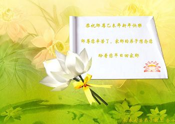 师尊辛苦了!在您的慈悲呵护下,弟子跟随师尊正法救度众生又迎来了新的一年。在新的一年里,弟子要更加精進不懈怠,多学法,向内找多去执着心,修好自己,做好三件事,救更多的众生,不辜负师尊的慈悲苦度。盼望神韵早日到大陆演出。在此谨代表被非法关押在杭州监狱的外甥同修恭祝师尊新年快乐! 四川两姐妹大法弟子(姐姐现被非法关押之中)向慈悲伟大的师尊问好!师尊新年快乐!
