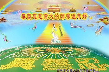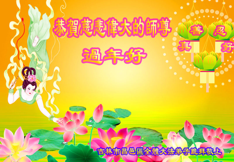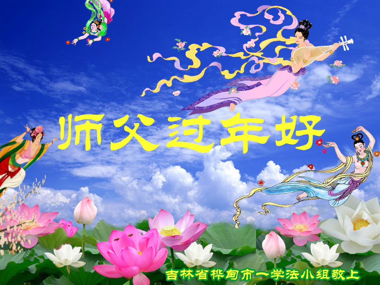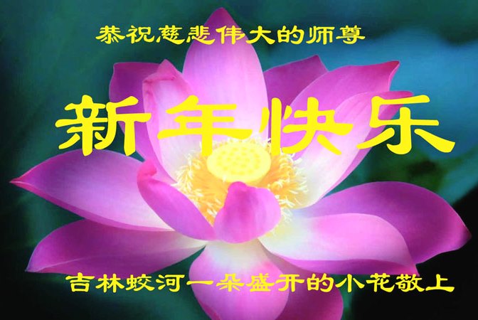 慈悲伟大的师尊:弟子给你拜年了!师尊过年好!新年快乐! 请师尊放心,我们一定听师尊的话,多学法,向内找修好自己,讲好真相多救人,让师尊少一份操劳,多一份欣慰。 全体大法弟子跪拜敬上! 吉林市全体大法弟子恭祝慈悲伟大的师尊过年好!