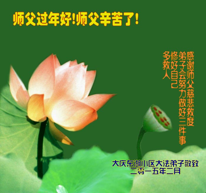 我们学法小组的大法弟子在修炼的路上,有修炼的喜悦,也有关过的不好的苦恼。我们在慈悲伟大的师尊的呵护下我们都走过来了。我们对慈悲伟大的师尊的感激无以言表。在中国皇历新年来临之际,我们学法小组全体大法弟子(6人),跪拜师尊,恭祝慈悲伟大的师尊过年好。我们决心遵照师尊的教导,“以法为师”、“向内找”、修好自己,多救人,让师尊多一点欣慰,少一点操劳。 辽宁省大连市金州新区一学法小组 2015年2月12日星期四 辽宁省大连一学法小组全体大法弟子恭祝师尊过年好!