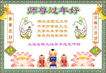大连一学法小组全体大法弟子恭祝师尊过年好!谢谢师父的慈悲苦度!师父您辛苦了! 在新的一年里,我们学法小组全体大法弟子一定学好法、认真对待学法,互相配合好,放下自我、圆容整体,完成史前大愿,圆满随师还! 学法小组全体大法弟子叩拜师尊!让师父多一份欣慰。 辽宁省大连大法弟子恭祝师父新年好!