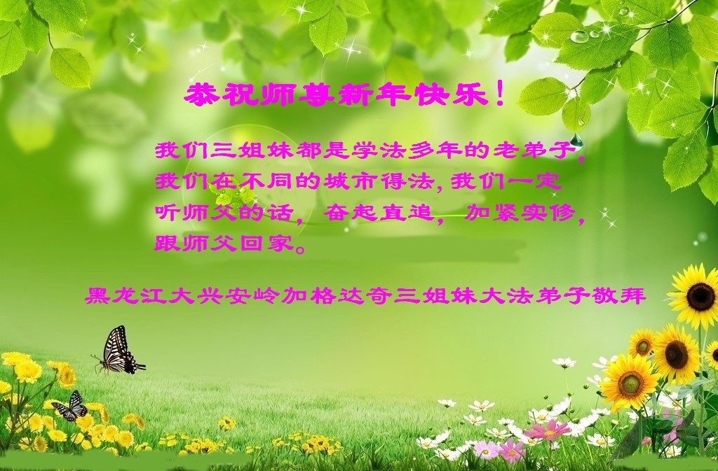 我们三姐妹都是学法多年的老弟子,我们在不同的城市得法,因为我们不精進,没有跟上正法進程,现在我们学习了师父的新讲法,加强了坚定的信念,我们一定听师父的话,奋起直追,加紧实修,做好三件事,跟师父回家。 黑龙江大兴安岭加格达奇三姐妹大法弟子敬拜 黑龙江省大兴安岭地区全体大法弟子给师尊拜年