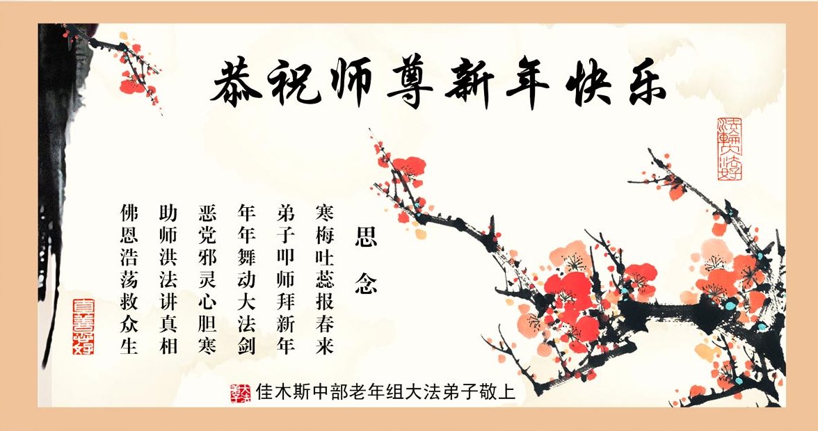 大法弟子祝贺, 师尊新年快乐。 弟子感恩敬谢, 叩首伟大主佛。 弟子修炼坎坷, 业力魔难较多。 坚定学好大法, 内找去掉执着。 正念除掉邪魔, 关关从容好过。 慈悲多救世人, 三:退.平安快乐。 弟子圆容配合, 精進每时每刻。 跟上正法進程, 他日必成正果。 黑龙江省佳木斯大法弟子及家人恭祝慈悲伟大的师尊新年快乐!