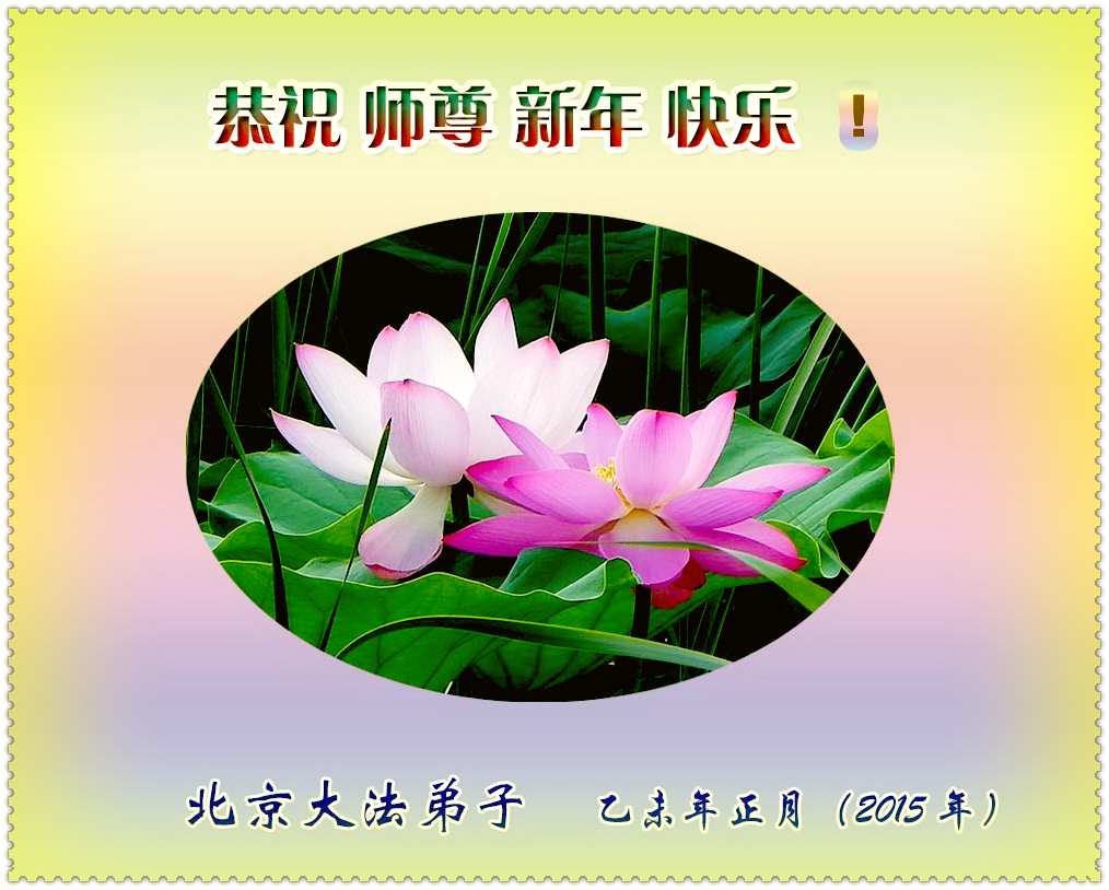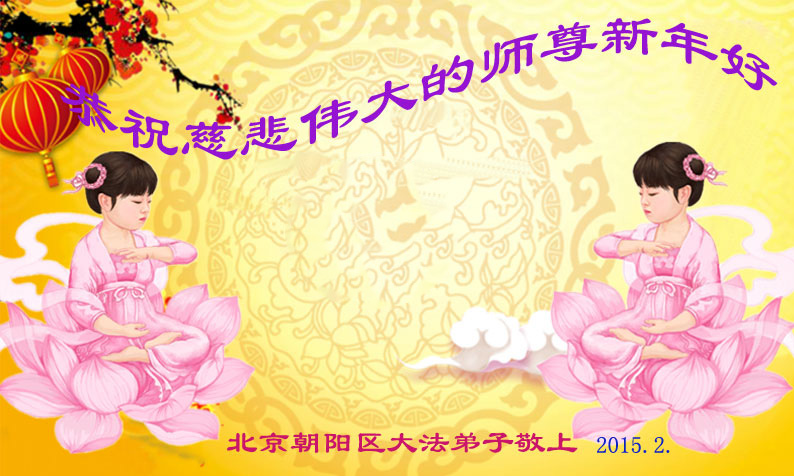 二零一五年中国新年将至,我们北京市朝阳区、通州区大法弟子满怀崇敬和感恩,向师尊拜年!恭贺洪大慈悲、至高无上的师尊新年好!新年快乐! 师父的洪大慈悲与巨大承受,使得我们能走到今天,大法开创的美好未来,召唤我们勇猛精進的走好今后的路,兑现我们的史前誓约,更多的救度众生! 无比感恩师尊!无比感谢大法! 北京市朝阳区、通州区大法弟子叩拜 北京市朝阳区酒仙桥地区、顺义区、后沙峪地区、昌平西关地区的大法弟子恭祝师尊新年快乐!