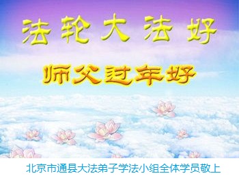 在新的一年里,弟子决心珍惜大法修炼机缘,抓紧实修自己,做好三件事,完成自己的史前誓约! 北京市通县大法弟子学法小组恭祝慈悲伟大的师父好!祝师父新年快乐!