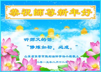 在2015中国新年即将到来之季,我们遥拜师尊新年好!师父您辛苦了! 在新的一年里,在随师正法的最后的时刻,我们只有用自己的行动做好三件事,精進、再精進,来表达弟子的感恩之心,直至法正人间。 胜利油田孤岛地区全体大法弟子恭祝师尊新年好!