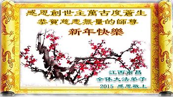 借此2015年的新年之际,江西省永修县全体大法弟子恭祝师尊新年快乐!跪谢恩师慈悲普度!弟子一定会在正法接近尾声的日子里走好走正。新年添正念,多救世间人! 江西省南昌市全体大法弟子恭祝师父新年好!